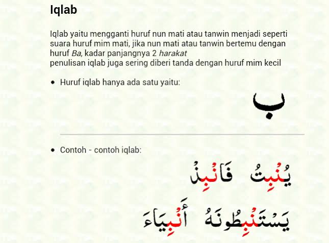 Jika ada nun mati atau tanwin bertemu. Nun mati bertemu ba aja iqlab masa aku ketemu kamu ga ijab. Cara membaca iqlab yaitu dengan menukar bunyi huruf nun sukun atau tanwin menjadi bunyi huruf mim mati disertai dengung.